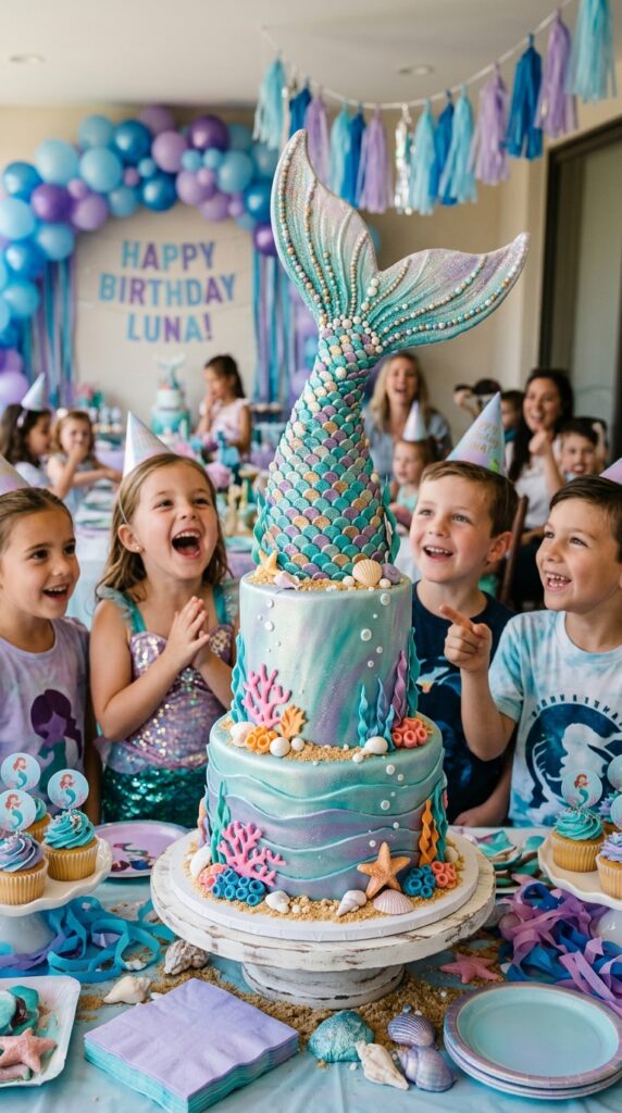 Every kid at the party will lose their mind when they spot a mermaid tail cake rising from the dessert table. These graceful mermaid tails create instant magic, especially when you cover them in shimmering edible glitter or pearlescent fondant.