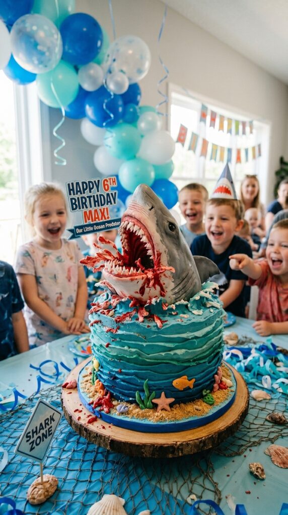 Add menacing shark teeth by cutting sharp triangles from white gum paste — they’re surprisingly easy to shape. Tint your vanilla buttercream red for dramatic effect. To complete the underwater scene, pair your shark cake with aquatic party decorations like blue streamers, bubble-shaped balloons, and ocean creature centerpieces that transform the entire party space into a deep-sea adventure. Trust me, the screams you’ll hear won’t be from fear — they’ll be pure birthday excitement.