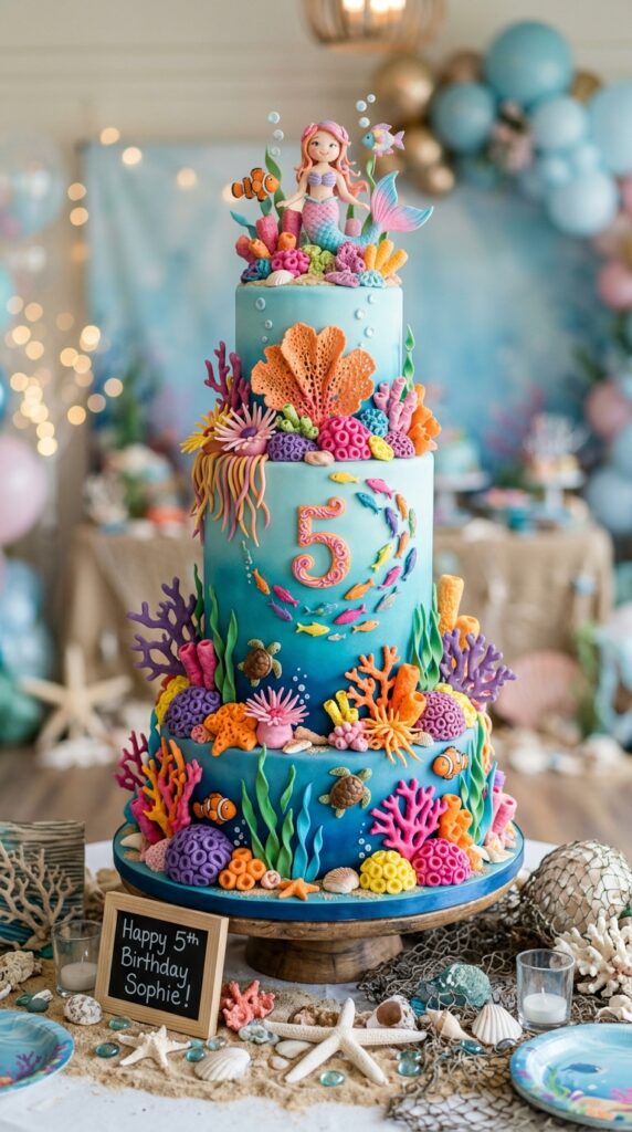 Coral reef cakes are honestly some of the most visually striking options you’ll find for an under-the-sea party. Bakers sculpt vibrant coral formations using gum paste or fondant, creating layers of texture that practically radiate. You’ll see bold oranges, hot pinks, and deep purples competing for attention — in the best way possible.