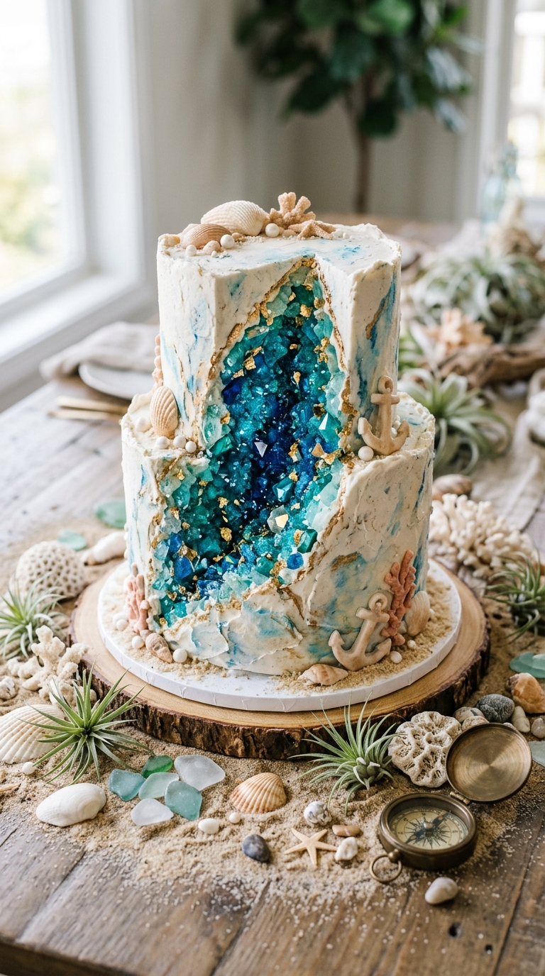 If character cakes feel a little too playful for your taste, geode ocean cakes swing hard in the opposite direction. These stunning creations mimic natural crystal formations inside a cake’s cut surface, giving guests that dramatic “wow” moment during the reveal.