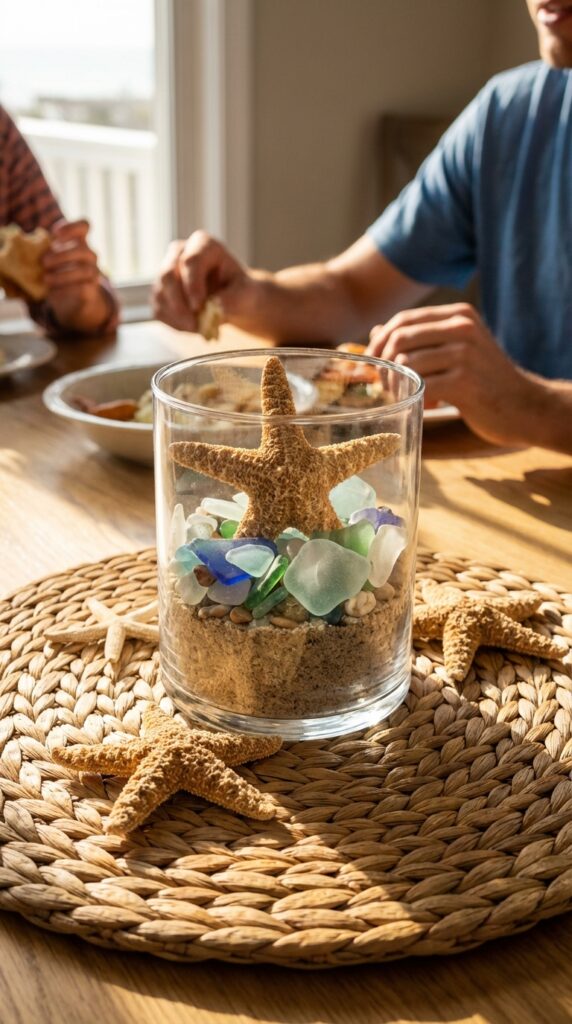 Want something more contained? Build custom sea glass terrariums using clear vases, sand, and collected glass pieces. They’re surprisingly easy to assemble and photograph beautifully.