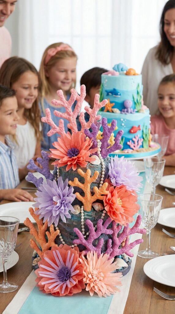 For a cohesive celebration, consider pairing your centerpiece with an under the sea cake featuring matching coral reefs, waves, and ocean animals to tie the whole theme together.