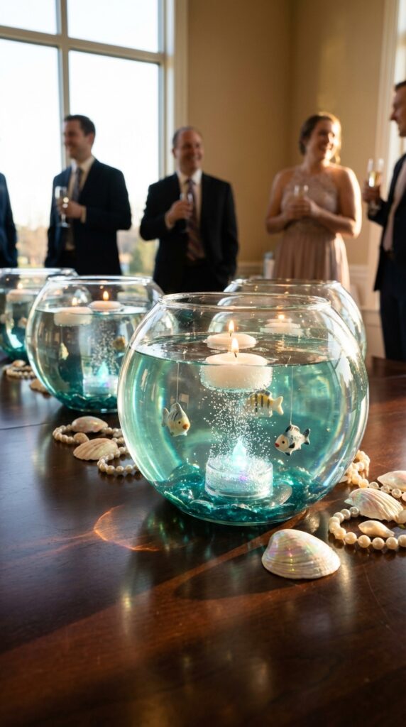 Think of each bowl as your own miniature aquarium display. Drop in some shells, pearls, and floating candles to layer the visual interest. Clear fishing line can suspend small fish figurines inside, making them appear to swim freely. It’s simple, affordable, and genuinely impressive — your guests won’t stop talking about it. For even more inspiration, consider incorporating underwater decor streamers alongside sea creature accents to enhance the oceanic atmosphere.
