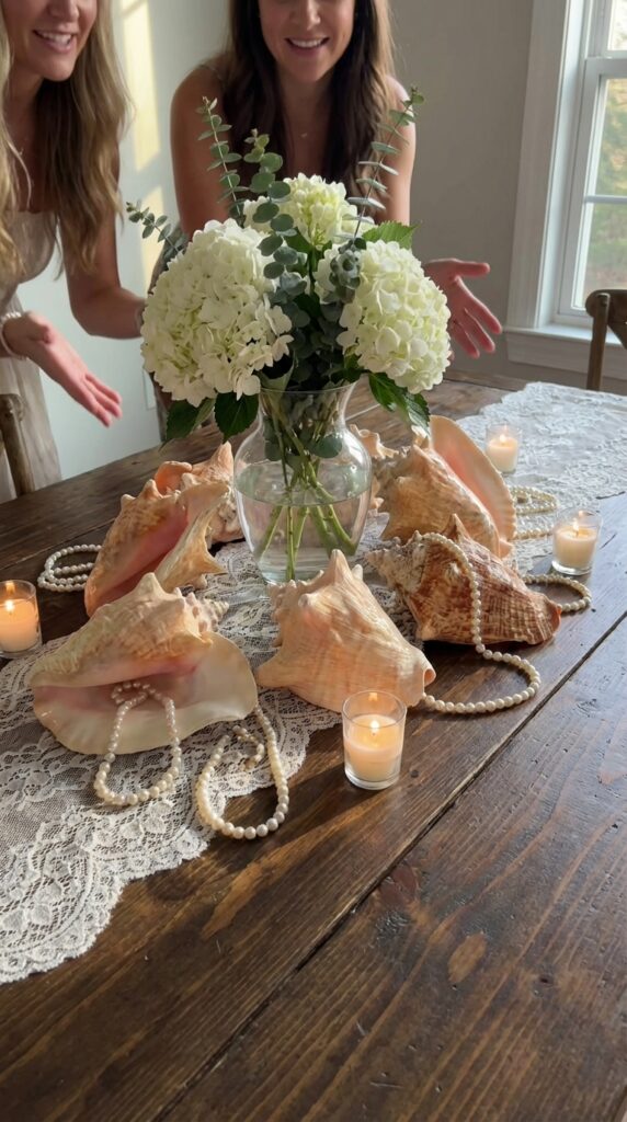 Arrange large conch shells around a clear vase, then scatter shimmering pearl accents throughout for instant elegance. You’ll want to mix shell sizes so nothing looks too uniform — variety keeps it interesting.