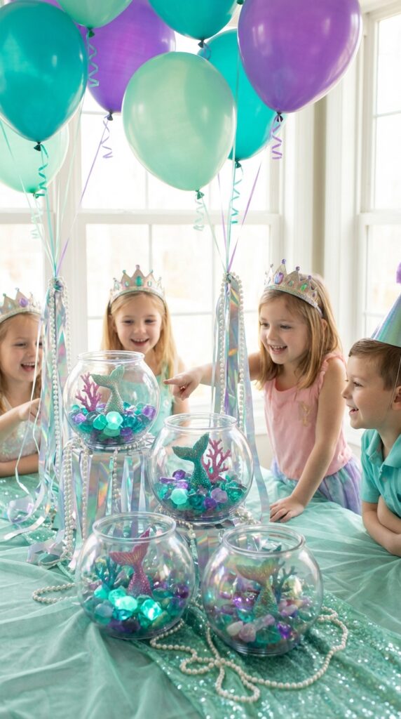 You can create enchanted mermaid displays using iridescent fishbowls filled with colorful coral, seashells, and glittery mermaid tail figurines. Kids absolutely lose their minds over these.