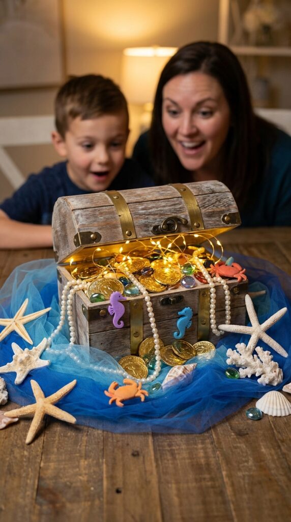 Your sunken treasure chest filling options are endless: gold coins, faux pearls, colorful gems, and foam sea creatures all work beautifully. Stack them high so they’re visibly spilling over the edges — that overflowing effect is pure magic.