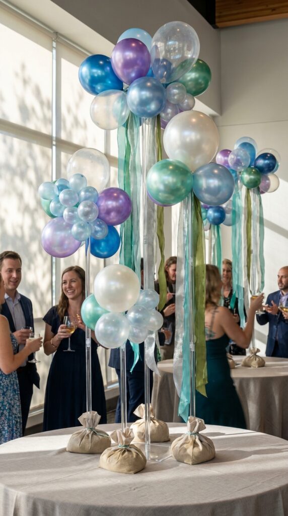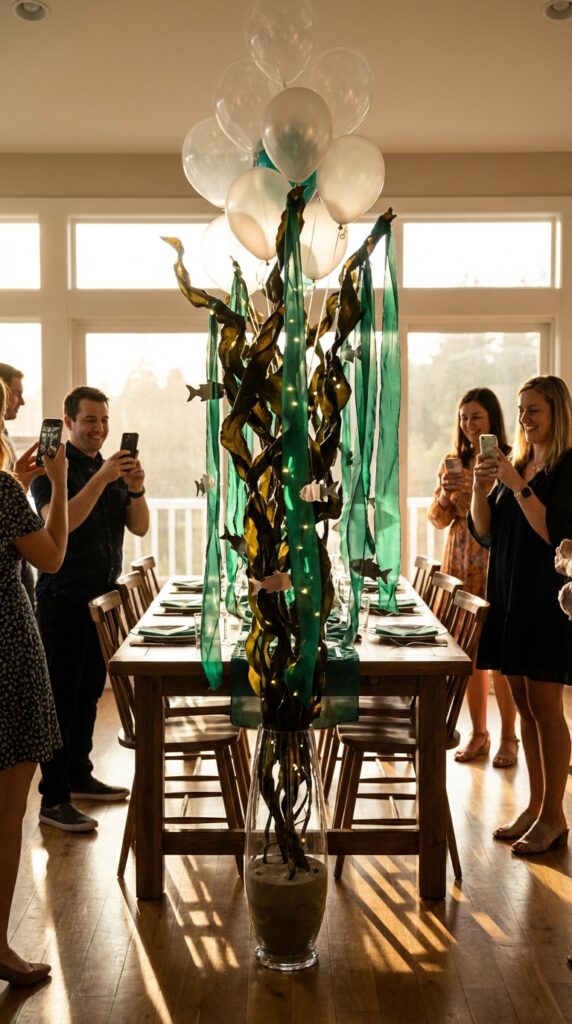 Build yours using a weighted base, like a sand-filled vase, to keep everything stable. Add varying heights for visual interest. To take the display even further, incorporate a balloon arch arrangement designed to mimic clusters of floating bubbles rising through the kelp, adding a whimsical dimensional layer that ties the whole underwater scene together. Trust me, guests won’t stop photographing them all evening.