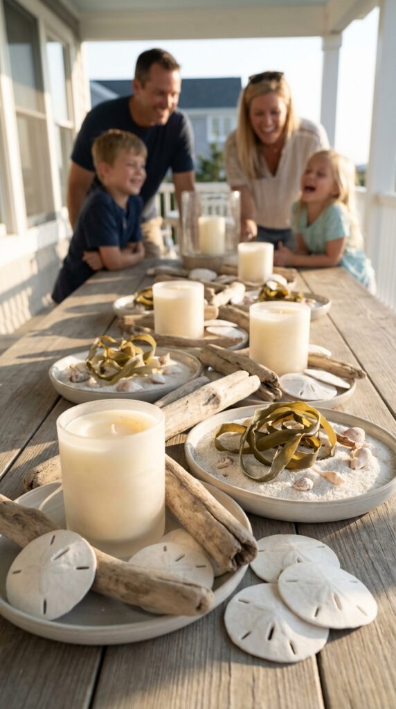 Arrange bleached sand dollars around chunky pillar candles nestled in shallow dishes filled with white sand — instant tide pool candle displays that glow beautifully at night.