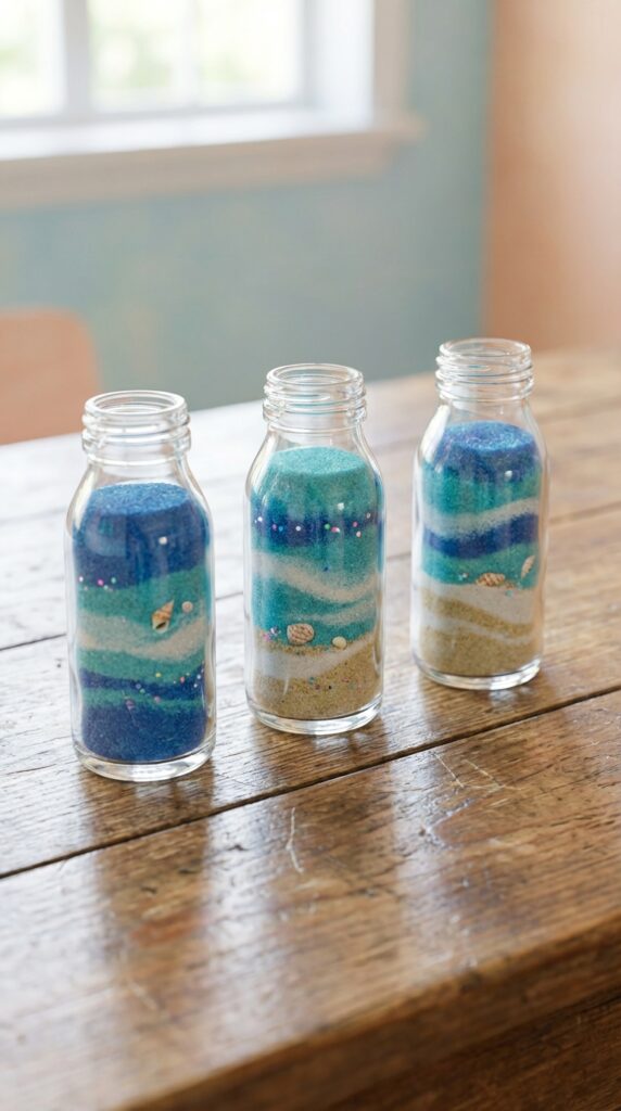 Few party favors hit that sweet spot between beautiful and hands-on, but sand art bottles with ocean layer designs do exactly that. You’ll find glitter layered bottles that kids can fill themselves, creating their own tiny ocean artwork right at the party table. The layering process keeps little hands busy while producing something genuinely stunning.