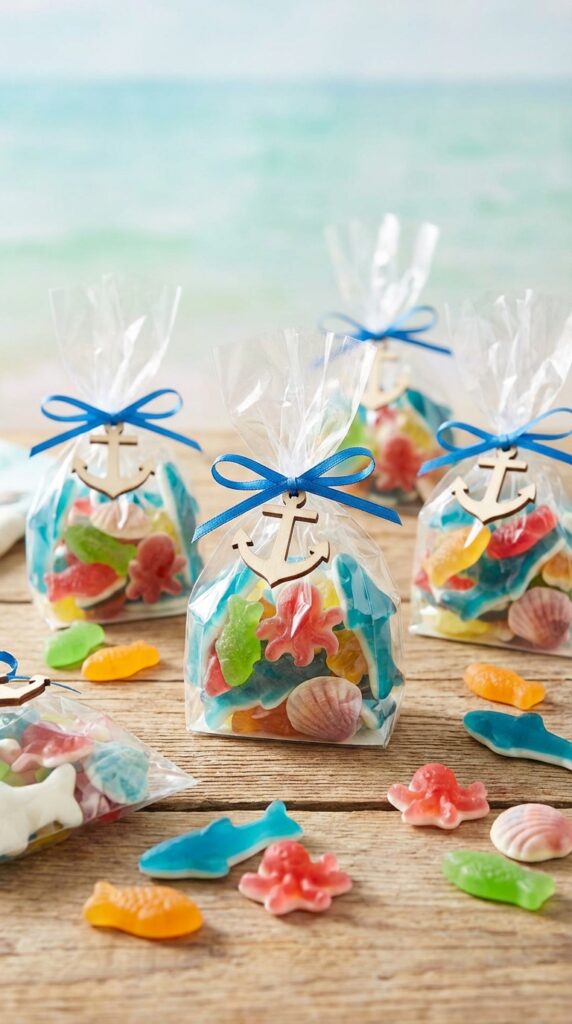 Gummy sea creatures are a party favor that pretty much sells itself — kids love candy, and these chewy little octopuses, sharks, and fish make the ocean theme impossible to miss. Fill small clear bags with ocean gummy assortments, then toss in a few edible seashell candies for extra charm. Tie everything with blue ribbon and a little anchor tag.