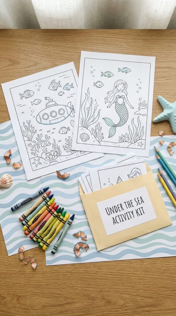 Not every favor has to be edible, and that’s where printable under the sea activity kits really shine. You can bundle printable coloring pages featuring fish, mermaids, and coral reefs into a cute folder or envelope. Add some crayons, and you’ve got an activity kids will actually use.