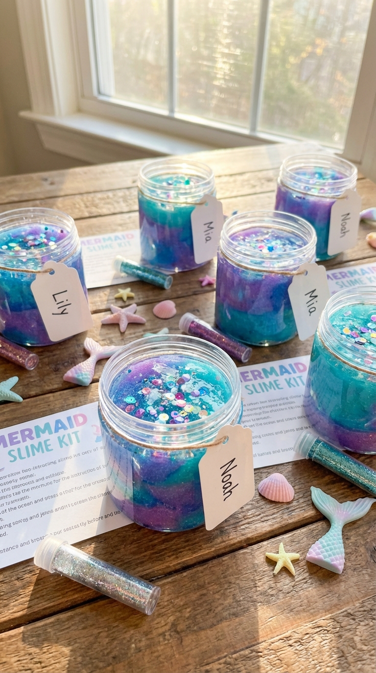 Every kid at your party will lose their mind over a mermaid slime kit, and honestly, the adults might too. Pre-fill custom slime containers with clear glue, activator, and glitter mermaid confetti so guests mix their own magical creation at home. It’s hands-on, sensory, and genuinely fun.