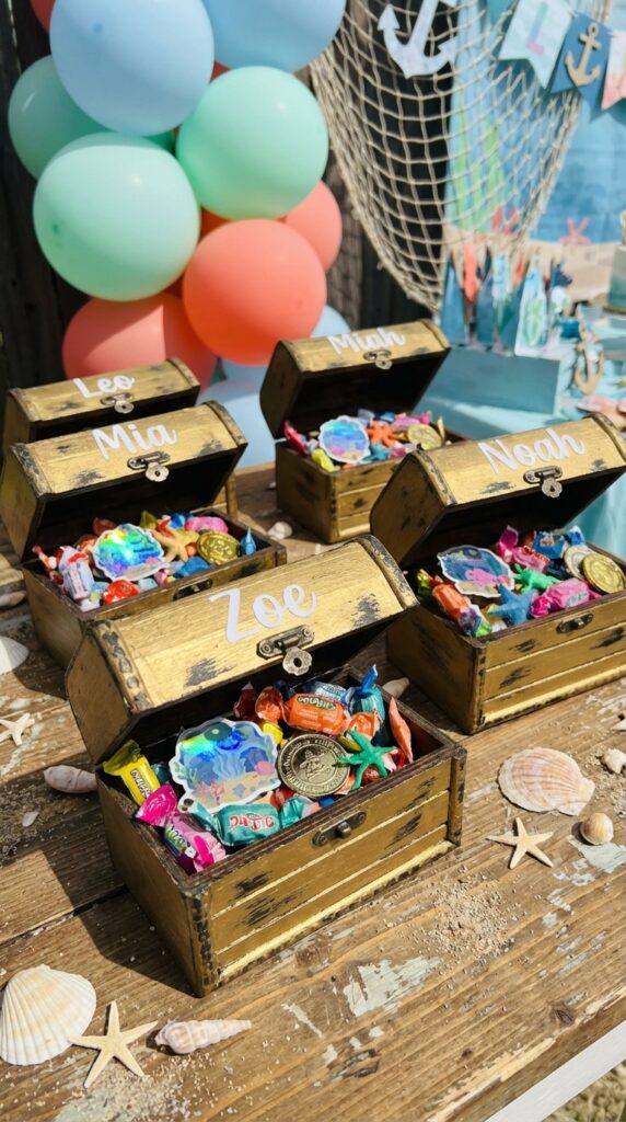 Treasure chests are the ultimate under-the-sea party favor — they practically sell the theme for you. Fill customized treasure chests with candy, stickers, or small toys, then add each child’s name using a label maker or vinyl sticker. It’s a small touch that makes kids feel genuinely special.