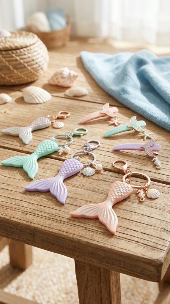Moving away from bubbles, let’s talk about something kids can actually keep long after the party’s over. Mermaid tail keychains and charms make fantastic favors because they’re practical and genuinely adorable.
