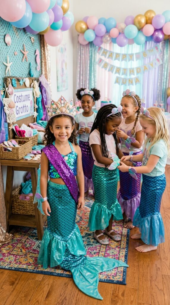 After those magical invitations arrive, it’s time to think about what everyone will actually wear to the party — and honestly, this is where the real fun begins. Set up mermaid costume stations where guests can accessorize themselves with mermaid themed dress up accessories like shimmery tail skirts, seashell headbands, and iridescent clip-on fins.