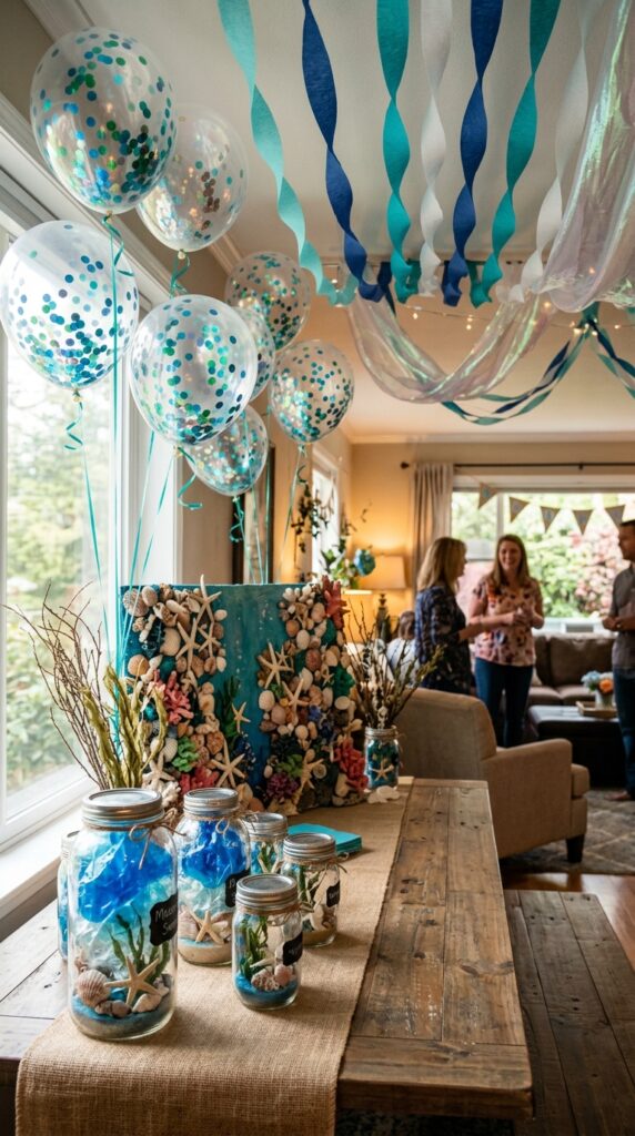 Your underwater theme decor comes alive with mermaid inspired centerpieces — think glass bowls filled with sand, seashells, and floating candles. Scatter pearl beads across tables and hang iridescent streamers everywhere.