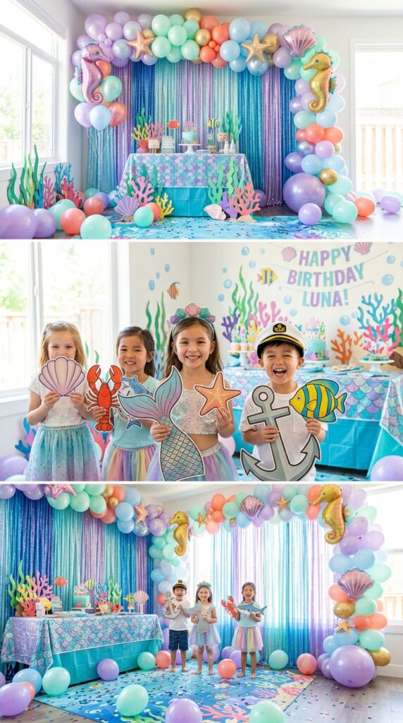 Don’t skip underwater photo booth props either. Pre-made sets include fish, shells, anchors, and mermaid tails that kids absolutely love holding. These props create memorable photos while doubling as party activities — that’s genuinely smart value for your budget.