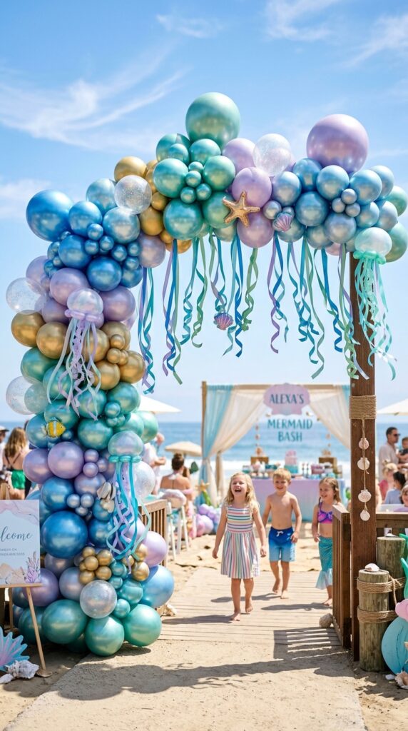 Balloons might seem simple, but they’re honestly one of the most powerful tools for altering a space into something spectacular. Cluster iridescent shell arrangements near your entrance using pearl-finish balloons in ocean blues, sea greens, and soft purples. They’ll catch every bit of light beautifully.