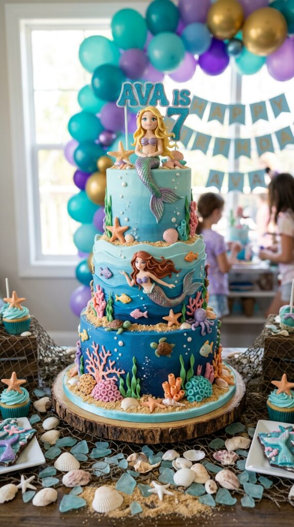 The cake is honestly the crown jewel of any under the sea birthday party, and there are so many stunning directions you can take it. You can request sculpted fondant designs featuring mermaids, coral, and starfish that look almost too pretty to eat. Almost.