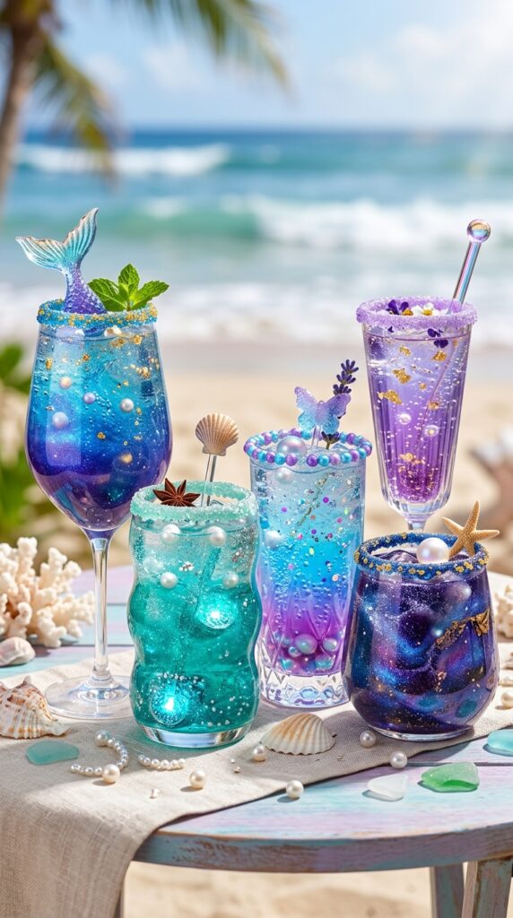 Drinks at an under-the-sea party deserve just as much attention as the dessert table. Try sparkling water infusions tinted with blue and purple food coloring for an instant ocean effect. Layer different shades in clear cups to mimic ocean depth — it’s genuinely stunning and surprisingly easy.