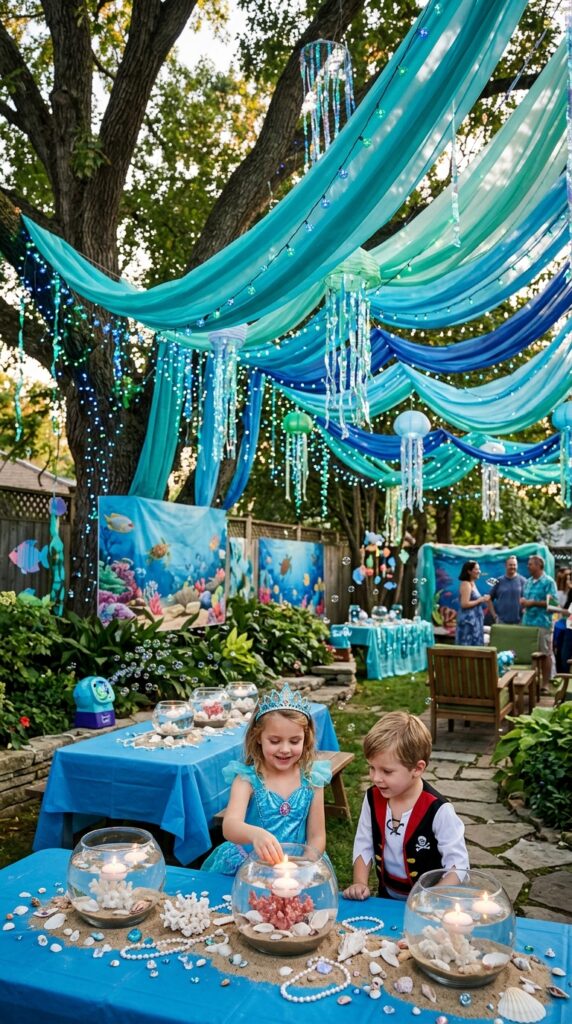 Start with blue and green string lights draped overhead to mimic sunlight filtering through ocean water. Add sheer teal and aqua fabric panels between trees or fence posts for that dreamy, flowing effect.