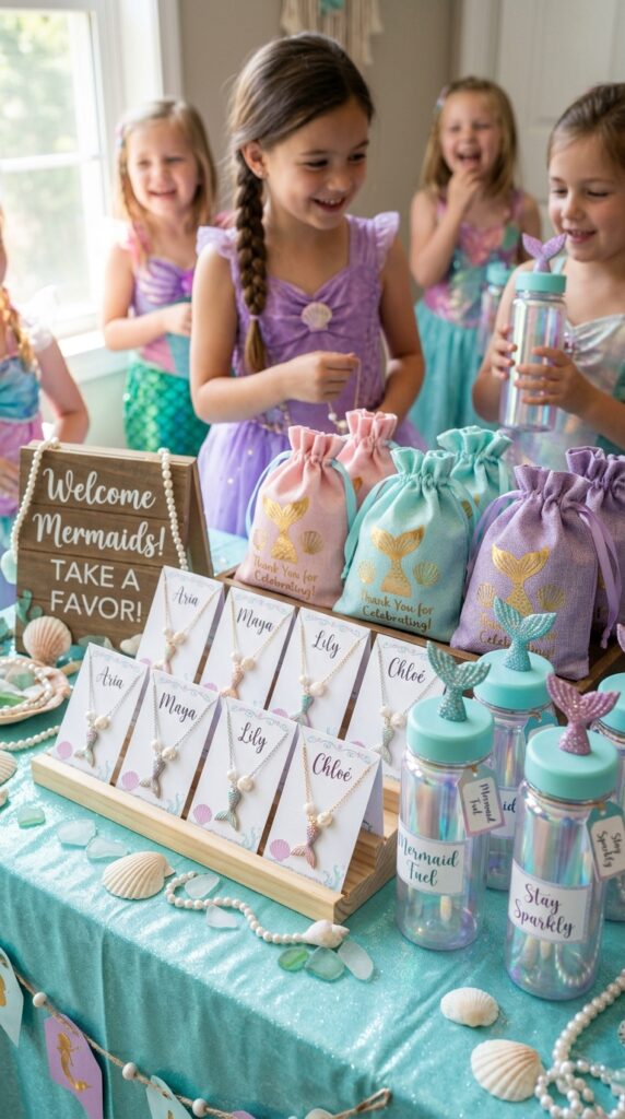Instead, go for customizable mermaid necklaces with their names or birthstones — girls genuinely treasure these. Pair them with reusable mermaid water bottles featuring iridescent scales or glittery fins. These get used daily, meaning your party stays memorable long after the cake’s gone.