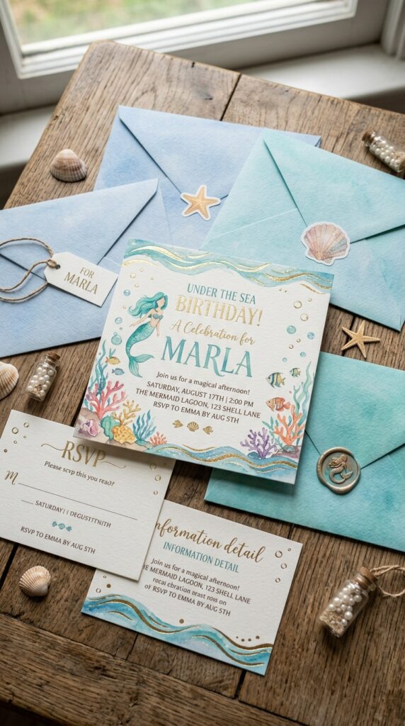Add details like “Dive In!” or “Join Us Under the Sea” to build excitement immediately. Seal each envelope with a starfish or seashell sticker for a polished finishing touch. Trust me, girls absolutely love receiving something that feels genuinely special before the party even begins.
