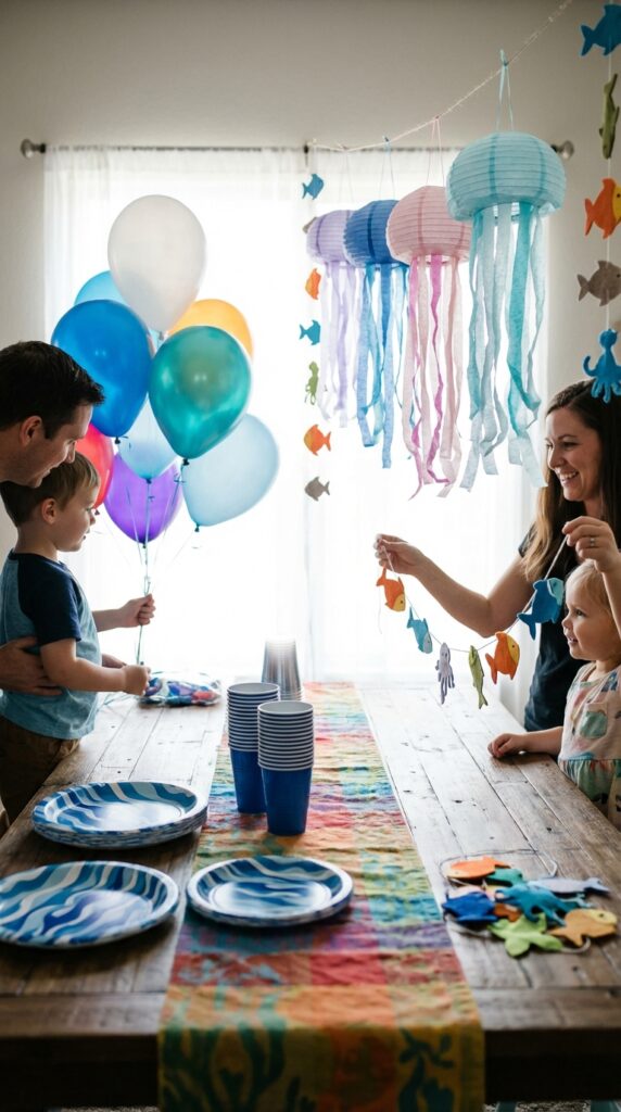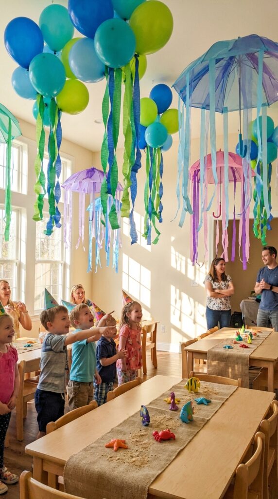 Add imaginative jellyfish decorations by hanging translucent umbrella shapes with ribbon tentacles from above. They catch the light beautifully and create that enchanting underwater glow everyone loves.