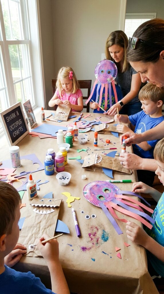 For something more elaborate, try ocean creature masks using paper plates, glitter, and elastic bands. Octopus masks with dangling paper tentacles work beautifully. These crafts keep kids engaged, spark creativity, and double as take-home party favors. Win-win!