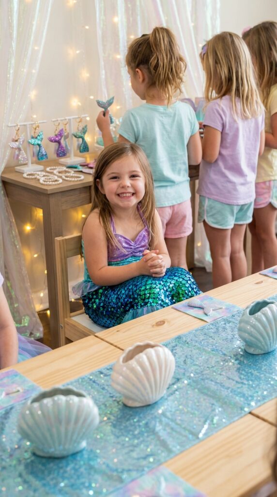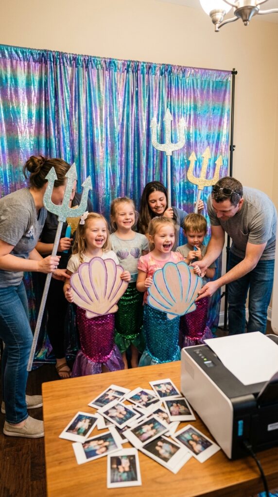 After the crafts station wraps up, a mermaid tail photo booth is one of those party additions that kids (and parents) absolutely love. Set up mermaid tail photo booth props like sparkly fins, oversized shells, and glittery tridents for instant fun.