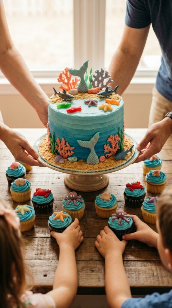 Want a DIY option? Crushed graham crackers mimic sandy ocean floors beautifully. Add gummy fish and seashell chocolates for texture. Your guests won’t just admire it — they’ll devour it. For even more inspiration, coral reef cake designs featuring waves and favorite ocean animals can spark creative ideas for your own masterpiece.