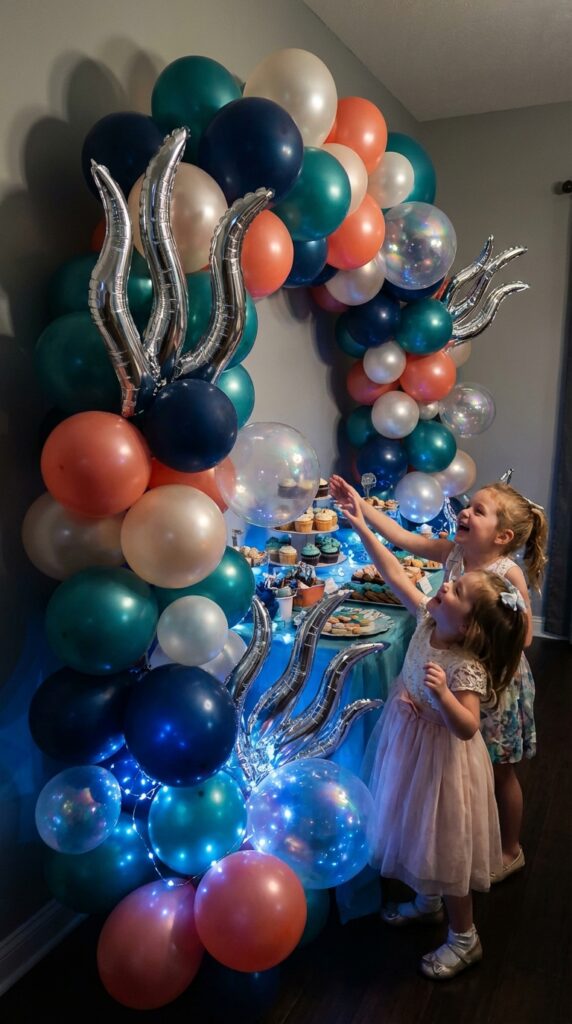 For balloon arch placement, position it above the dessert table or entrance to maximize visual impact. Layer in seaweed-shaped foil balloons and iridescent bubbles for depth. You can also incorporate sea creature balloon shapes like jellyfish, starfish, and octopuses to make your arch feel like a true underwater scene.