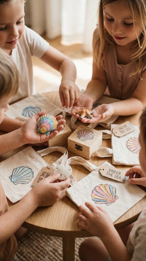 Think painted shells, small shadow boxes, or mini terrarium kits. You can also do personalized party favors — custom water bottles, tote bags, or jewelry pouches printed with each child’s name. Kids actually hold onto things that feel made just for them. That personal touch makes all the difference. For a finishing touch, filling a ocean-themed goody bag with a mix of small treasures like starfish trinkets, sea glass, and sand dollar magnets gives guests a cohesive and memorable send-off.