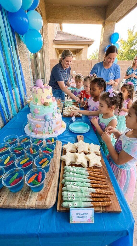 For under the sea themed desserts, try a tiered cake decorated with fondant sea creatures or cupcakes topped with blue frosting and edible pearl sprinkles. Kids absolutely lose it over “seaweed” pretzel rods dipped in green chocolate. These small details metamorphose ordinary food into memorable, Instagram-worthy party moments. For a more elevated spread, consider incorporating ocean-inspired dishes like seafood skewers, crab-shaped deviled eggs, or fish-shaped crackers paired with dips to give your table a truly immersive underwater feel.