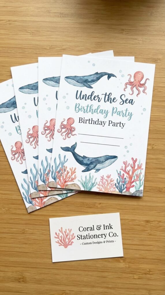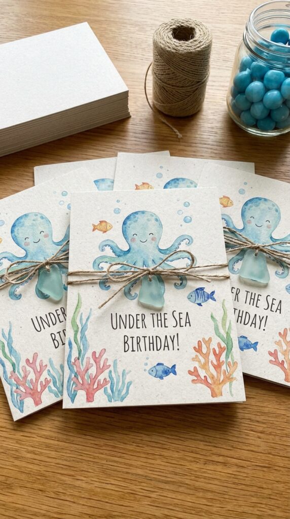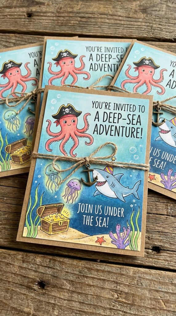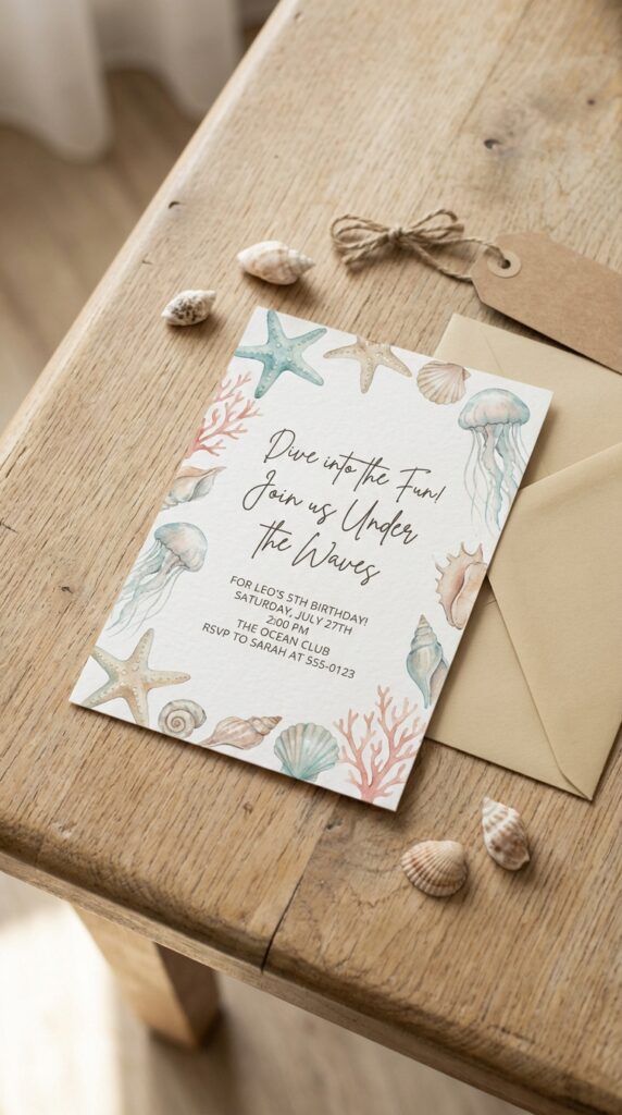 Add iridescent glitter accents or a foil finish for extra wow factor. Trust me, parents will photograph these before they even RSVP — that’s the magic you’re after. Your invitation design can even preview the deep-sea decor and ocean-themed activities guests can look forward to at the party.