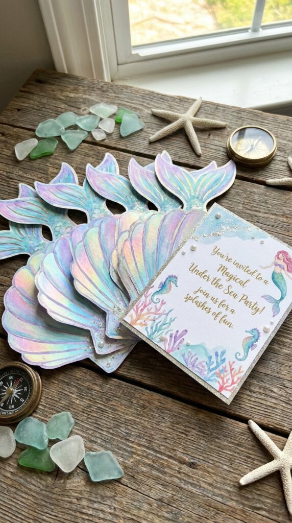 Budget friendly printable options also let you adjust wording yourself, saving on designer fees entirely. Choose cardstock paper for a premium feel that doesn’t look cheap. For an extra touch of magic, look for designs featuring soft pastel sea colors alongside mermaids and pearls to give your invitations an enchanting, sparkly ocean feel. Your guests won’t suspect you spent under $20 total, and honestly, that’s a beautiful little secret worth keeping.