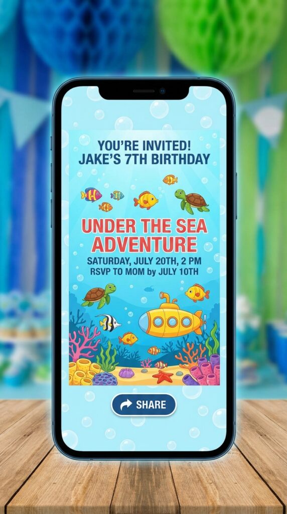If you want to skip the printing hassle entirely, digital under the sea birthday invitations are a fantastic option. Platforms like Canva and Evite offer stunning digital invitation templates featuring waves, fish, and coral designs you can customize instantly.