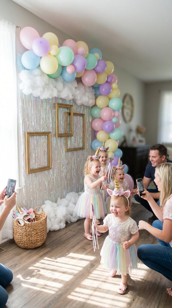 Hang creative backdrops like a shimmery rainbow curtain or a balloon cloud wall featuring pastels and gold accents. Add interactive elements that kids can actually touch and hold — think oversized unicorn horns, glittery wands, and sparkly ears on headbands. Position good lighting nearby since toddler photos need all the help they can get. Keep props accessible in a small basket so little hands can grab them independently. For an extra touch of magic, unicorn party backdrops featuring iridescent fabrics or foil fringe curtains can instantly transform a plain corner into an enchanting photo-worthy scene.