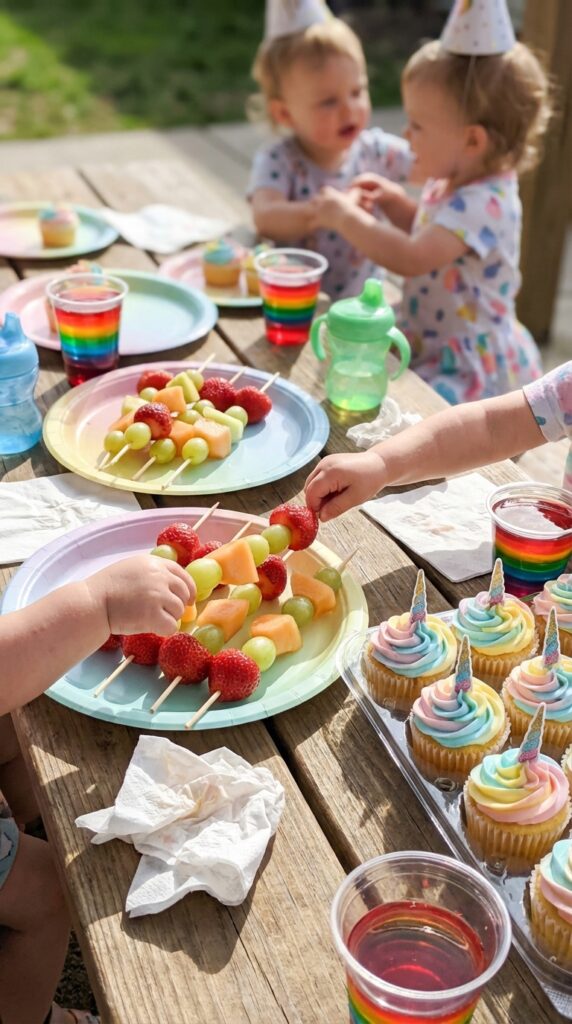 Keep portions small and finger-food friendly. Toddlers don’t need elaborate plates, they need snacks they can grab and go. Unicorn-themed birthday treats are a fun way to bring the whole party aesthetic together through food without overcomplicating the spread.
