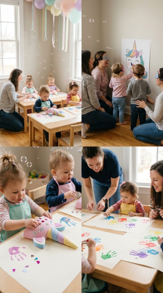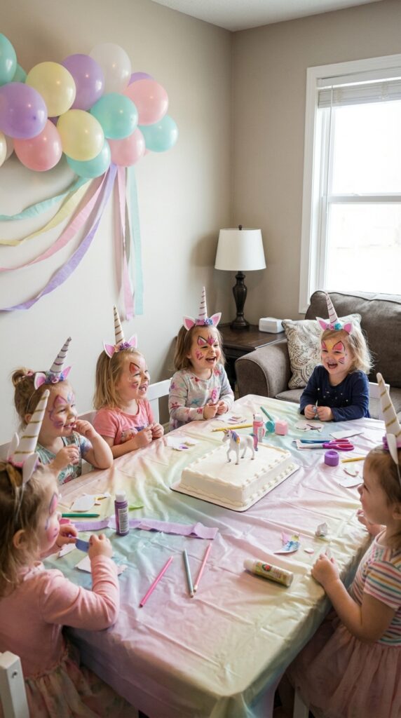 Short bursts of activity beat long structured games every time. Rotate every ten minutes, and you’ll keep everyone happy and meltdown-free. A unicorn themed party works especially well for three-year-olds who are just beginning to engage with imaginative and magical play.