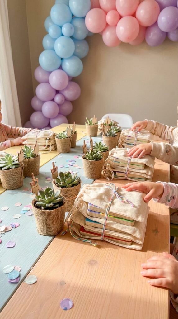 Choose sustainable unicorn favors that actually get used. Think small potted succulents with unicorn horn picks, reusable snack bags printed with rainbow designs, or chunky crayons shaped like stars.