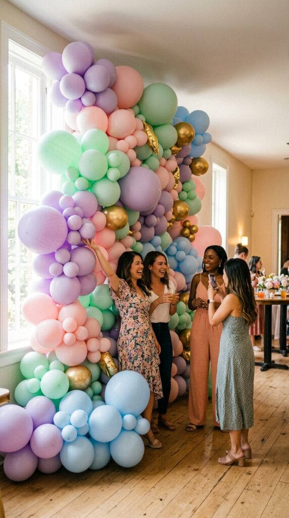 Don’t just pile balloons together randomly. Creative balloon arrangements, like organic garlands with varied sizes, look far more polished than uniform clusters. Mix in some gold metallic balloons for a touch of shimmer.