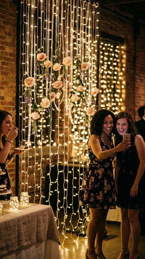 Hang warm white or pastel-colored LED curtain lights behind your dessert table, then layer in hanging floral arrangements using silk roses, lavender, and iridescent ribbons. The combination creates depth that photographs beautifully. Pro tip: set your phone camera to portrait mode — those glowing lights blur into gorgeous soft orbs, making every snapshot look intentional, polished, and utterly enchanting.