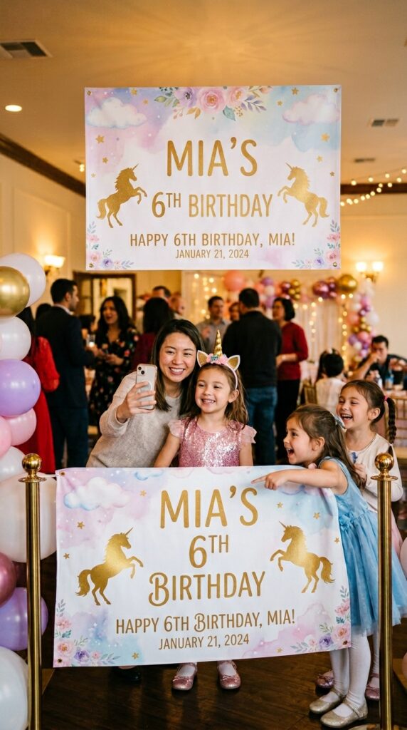 When it comes to backdrops that truly make a statement, personalized unicorn banners are honestly underrated. You can order custom unicorn silhouettes printed alongside your child’s name, age, or a fun phrase. It’s surprisingly affordable through services like Canva Print or Zazzle.