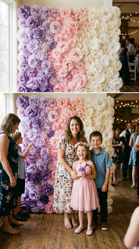 Pick colorful tissue paper in soft pinks, lavenders, and whites, then arrange your layered paper flowers in an ombre fade. Start deep at one corner and gradually lighten across the wall. The gradient effect photographs incredibly well, especially with natural lighting.