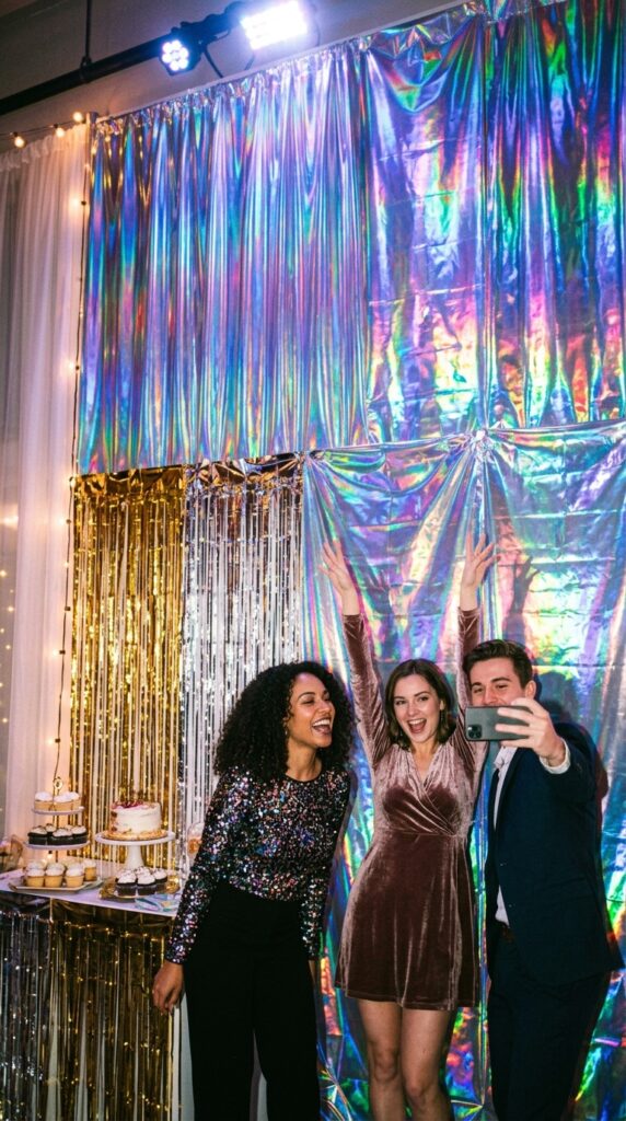 Few backdrops scream “unicorn party” louder than holographic and metallic options. These materials catch every bit of light and convert it into something magical.