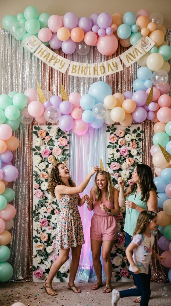 Pro tip: anchor your wall with a sturdy frame or foam board first. It’ll save you from chasing runaway balloons mid-setup. Trust me on that one. For an extra festive touch, incorporating colorful unicorn balloon decorations into your backdrop creates a whimsical focal point that ties the entire magical theme together.