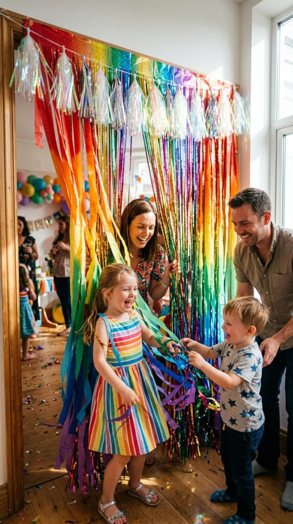 When you’re ready to level up your unicorn party backdrop, rainbow streamers and fringe curtains are your secret weapons. Layer glitter streamers across a doorframe or wall for instant sparkle that photographs beautifully. They’re affordable, lightweight, and surprisingly easy to hang.
