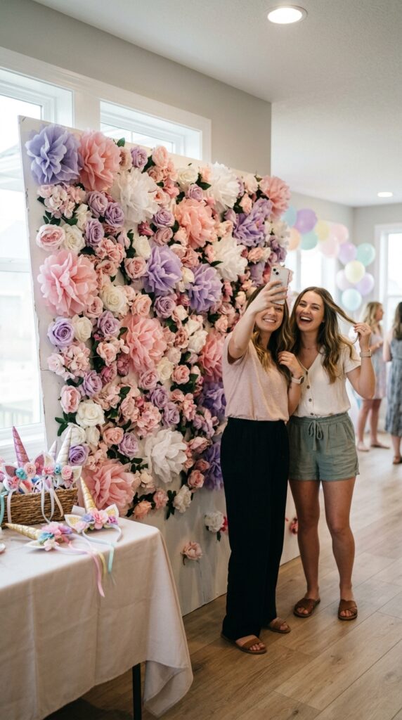 Simple assembly means you’re just hot-gluing blooms onto a foam board or hanging mesh panel. Arrange flowers in pastel pink, lavender, and white clusters for that dreamy unicorn aesthetic. You can build an impressive 3×4-foot backdrop for under $30. For an extra magical touch, unicorn party crafts like DIY horn centerpieces or glittery streamers can complement your flower wall and tie the whole setup together. Honestly, guests will assume you hired a professional decorator — no need to correct them.