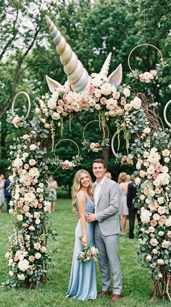 Nothing alters a birthday backdrop quite like a giant unicorn horn arch framed with cascading florals. You can pair silk peonies, roses, and eucalyptus for a lush, dreamy effect that photographs beautifully. Add unicorn headpieces along the arch’s sides to reinforce your theme without overwhelming the design.